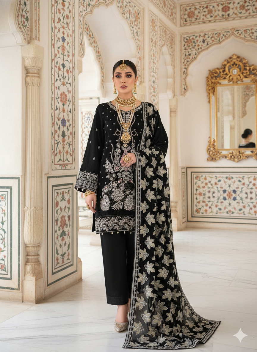 A beautifully embroidered 90/88 lawn ensemble with back and sleeves, premium chickenkari bimber dupatta, and plain 60/40 trousers, showcasing Gulposh's quality and craftsmanship.